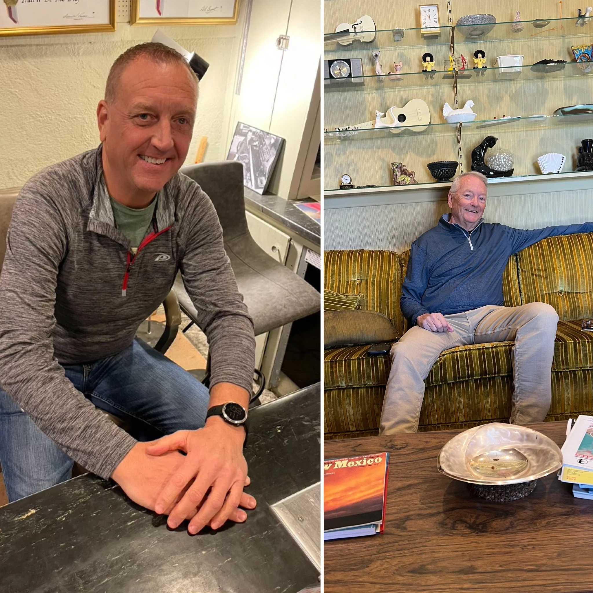 L- Tommy sitting behind control board in same chair as Buddy Holly. R- Randy Brown on the couch in the back apartment in same spot where Buddy’s picture was taken.